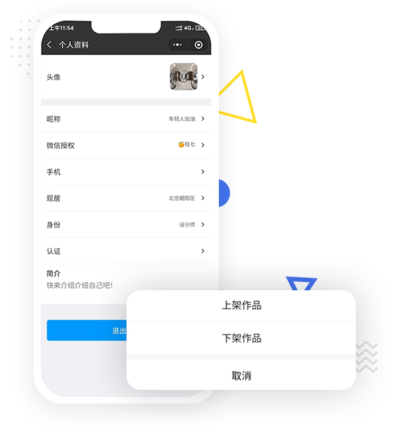 支持作品上架、下架管理、个人信息管理